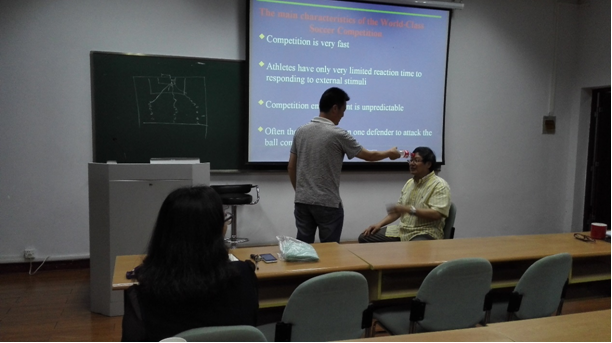 下午,王晋教授来到体育学系所在的西二教学楼,为系里的老师和硕士研究生们做了以“用科学方法建立中国校园足球体系”为主题的讲座。王晋教授由美国奥委会的运作引出美国现有运动员队伍培养中的科学性,指出美国运动员培养中的体育和学业并重,点明构建中国校园足球体系的重点就是要把握好学业和体育的关系。王晋教授进一步介绍了美国的体育体系,从学校体育到体育俱乐部,再到奥运竞训中心,层层递进之中,都与学业和体育全面发展紧紧相连。王晋教授还结合自身与足球的渊源,结合美国体育发展的经验,解释了建立校园足球体系的重要性及其作用,提出了自己对于建立和完善中国校园足球体系的建议:从要重视学生德智体全面发展,到实行基于学生学业成绩和足球运动成绩双重评价的教练员雇佣体系,再到作为发展校园足球激励机制的国际交流项目,激励团队合作,推进足球的开放式训练,做好足球教练水平等级认定,等等。在分析足球体系之余,王晋教授还从足球运动本身的角度,分析了巅峰足球表现的五大因素、世界级足球比赛的主要特点以及足球技能的具体特征,与在场师生分享了自己几十年研究的宝贵心得。讲座最后,王晋教授与在场的师生进行了问答交流,并合影留念。
