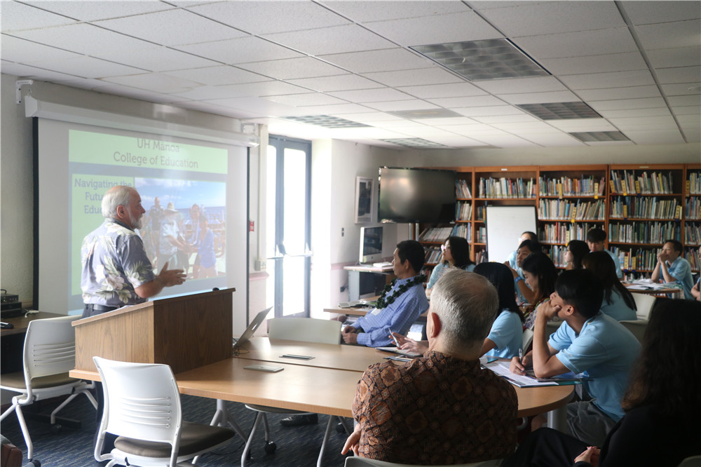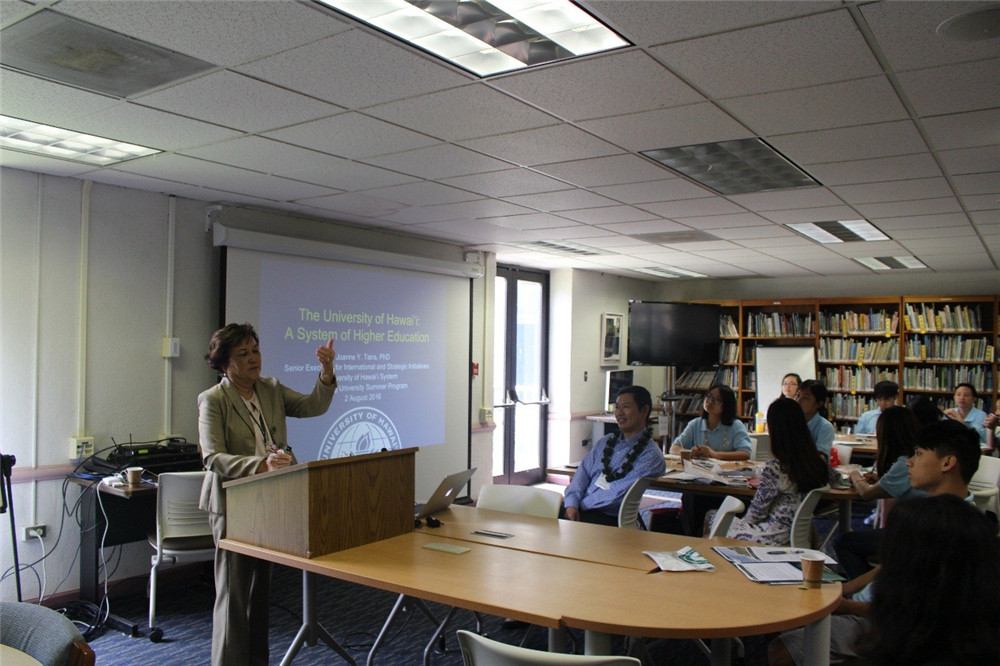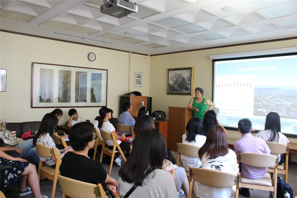 概况。夏威夷大学系统的副校长Taira女士从整体出发,详述了夏威夷大学系统内各院校之间的区别与特色、专业设置、招生规模、国际合作交流、产学研发展模式、系统内部院校的学分转换等情况,将此次夏令营活动作为两校之间成功合作的开始,并对未来深度合作寄予希望。马诺阿分校校长助理 Cambra博士则从学校的办学定位、学科优势、人才培养、校园环境等方面给予了较详细的概述,同学们由此获得了夏威夷大学马诺阿分校丰富的学术信息。为促进同学们对夏威夷独特自然地理风貌的了解,地理专家Rowland博士声情并茂地介绍夏威夷火山的形成、地壳板块运动规律、火山与地震状况的监测等,促进同学们对夏威夷火山及自然风貌的科学认识。