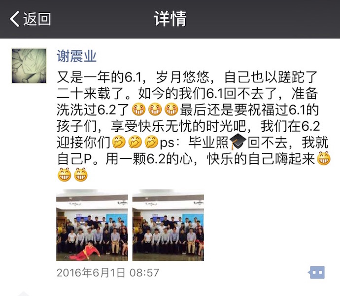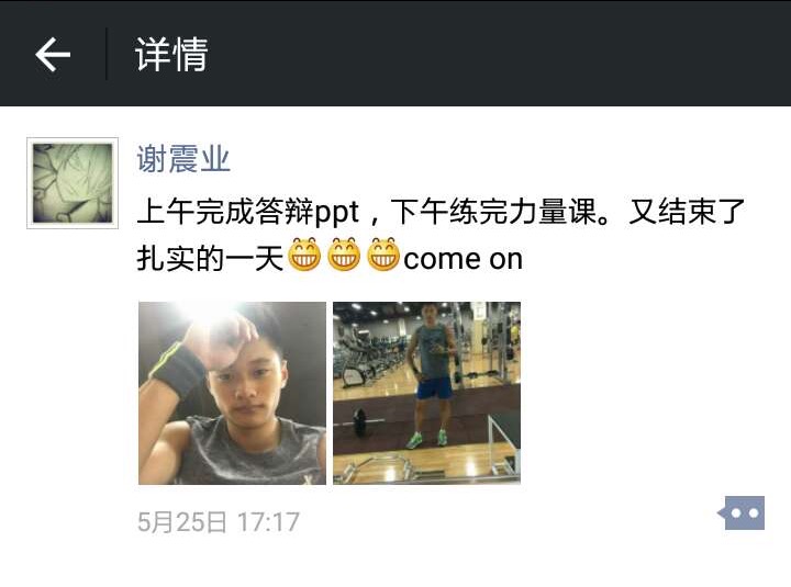 突破自己,也是作为浙江大学运动训练2012级本科生的小谢同学的梦想。频繁赛事,令谢震业与同学少了一些共同校园生活,但并没影响彼此对求是学子身份的珍爱和认同。院系专业课、专业班级群、求是青年论坛、浙大奖学项目……在生活点滴当中,我们看到了这个大男孩如何在融入、参与、立心求是。在时而严肃时而“逗比”搞怪的交流当中,我们看到这个大男孩如何克服学业与竞训的矛盾,如何与同窗分享荣耀、分担责任,又如何牵挂母校、师友,有实力、有担当、不骄傲、不做作的小谢同学,不知不觉圈住了一大波“迷弟”、“迷妹”和大小“师父”的心。2016年夏季,谢震业如期完成本科课业、毕业论文答辩并获得学士学位。2016年秋季,谢震业将再次入学攻读硕士研究生。