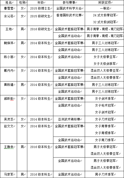 武术与民族传统体育专业同学利用暑期继续加强理论学习与专业实践,在武术科学大会、亚洲武术锦标赛、香港国际武术比赛、全国武术套路冠军赛、全国武术运动会等多项重要赛事中屡创佳绩,展现出不断进取的精神风貌和努力拼搏的体育精神。