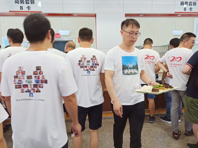 7月28日,全体同学从全省各地市区赶来,换上统一的纪念班服,前往学校一食堂二楼就餐,体会大学时排队打饭的场景,围桌聊天、共进午餐、谈笑风声的美好情景历历在目。