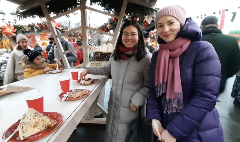 在实习之余,我参观了红场、特列季亚科夫画廊、阿尔巴特街等地方,并观看了令人震撼的芭蕾舞表演——《巴黎圣母院》。实习期间,我还有幸赶上了俄罗斯在1月初的圣诞节和2月底的谢肉节(送冬节)活动,体验到了节日氛围浓厚的红场,以及各大公园和广场举办的各式各样活动。我和同事Galina在红场集市吃到了俄罗斯喜剧演员做的煎饼,并在公园观看了烧稻草人活动。在莫斯科,除了传统的沙拉和三明治,这里还有来自世界各地的美食,比如格鲁吉亚美食、印度美食、披萨和汉堡等。