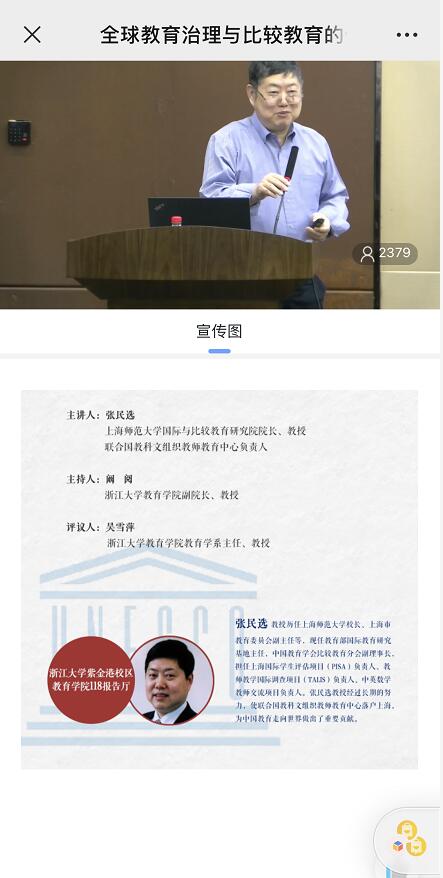 11月19号上午,上海师范大学国际与比较教育研究院院长、联合国教科文组织教师教育中心负责人、1986届比较教育学校友张民选教授应邀作题为“全球治理与比较教育研究者的新使命”的专题讲座,本次活动也是之江青年论坛系列活动之一。浙江省社科联一级巡视员邵清、lol下注平台 院长顾建民教授、副院长阚阅教授和孙元涛教授、教育学系系主任吴雪萍教授等出席讲座,梅伟惠副教授、刘淑华副教授以及百余名教育学科学生参加此次讲座。本次讲座还专门开设线上直播,2000余名师生通过线上平台收看此次讲座。