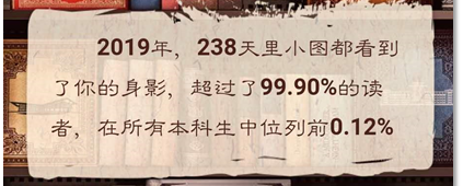 2019年打卡图书馆238天,在本科生中位列前0.12%;2018年打卡图书馆208天,在本科生中位列前0.01%。这是一组“冷门”记录,今天的这位主人公,她历年的图书馆打卡率超过了99.9%的读者。