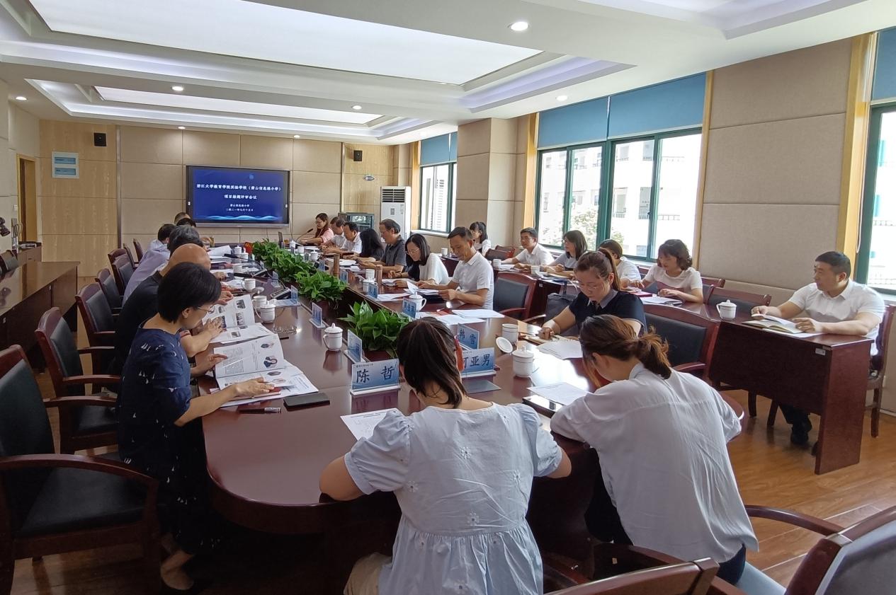 院长顾建民、党委书记吴巨慧,萧山经济技术开发区社发局公共服务科科长孙海良,信息港小学校长倪鉴、党支部书记陈剑东,项目首席专家盛群力、项目组组员刘徽以及该建设项目相关成员等20余人参加了会议,会议由信息港小学副校长陈森燕主持。