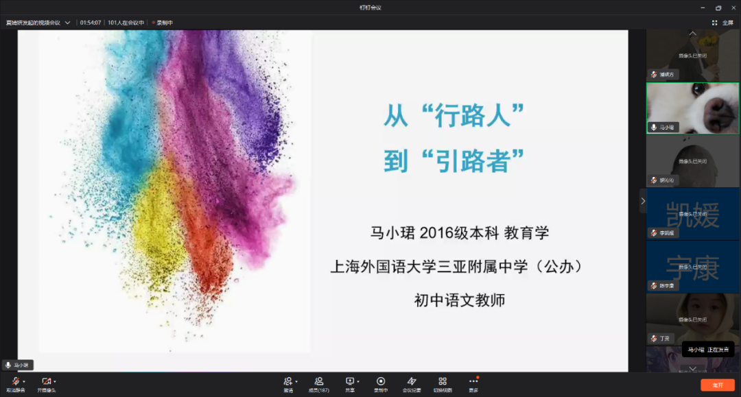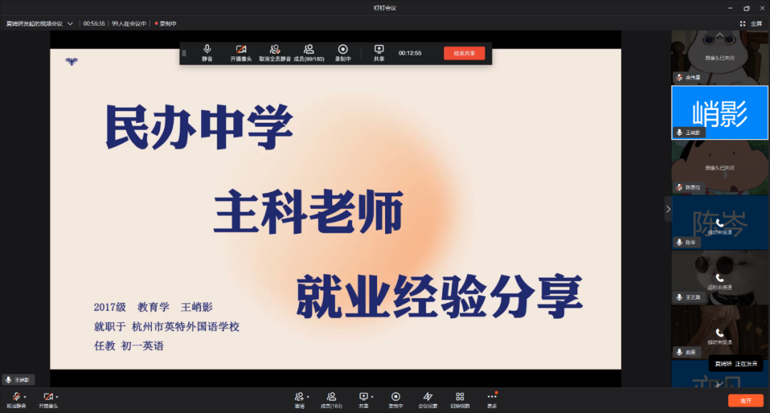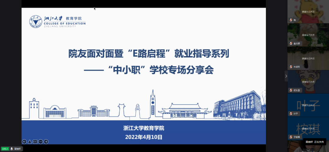 2022年4月10日下午,lol下注平台 院友面对面暨“E路启程”就业指导系列——“中小职”学校专场分享会以钉钉视频会议的线上形式顺利开展,共有100余名lol下注平台 学生在线参与本次云端分享会活动。本场活动为2022春夏学期首场就业分享会——教育单位专场,共邀请到了五位现任职于学校单位的院友,岗位涵盖公办和民办的中小学以及职业学校。