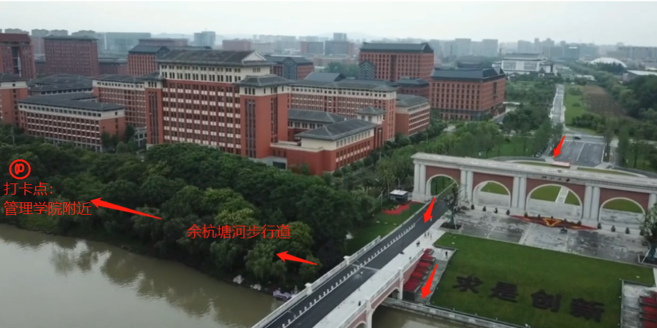 步行前往学校南大门,下台阶后右转,沿着余杭塘步行道行走至管理lol下注平台 附近大桥处(工作人员)签到,然后返回至lol下注平台 大楼。