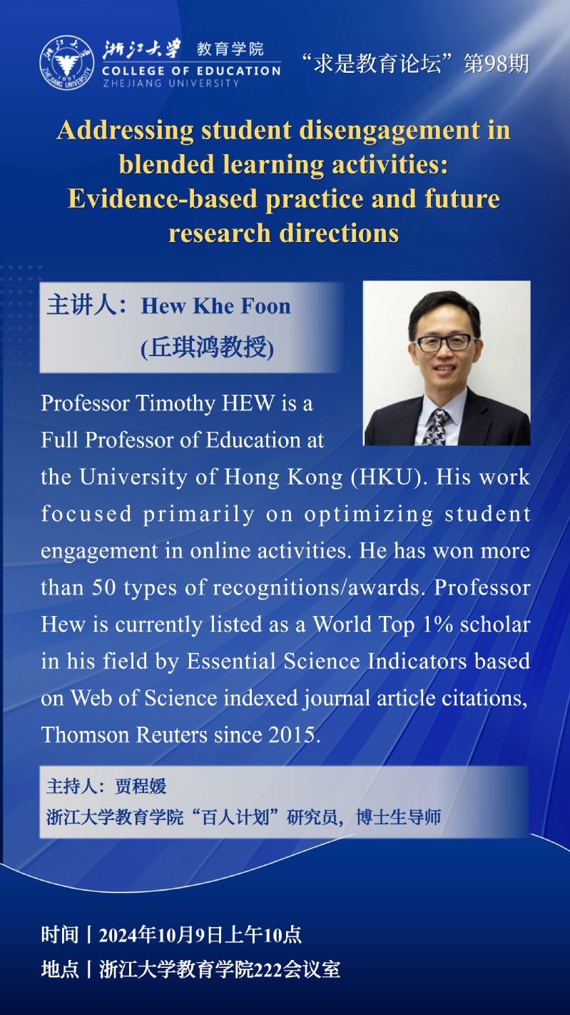 “求是教育论坛”第98期丨Addressing student disengagement in blended learning activities: Evidence-based practice and future research directions