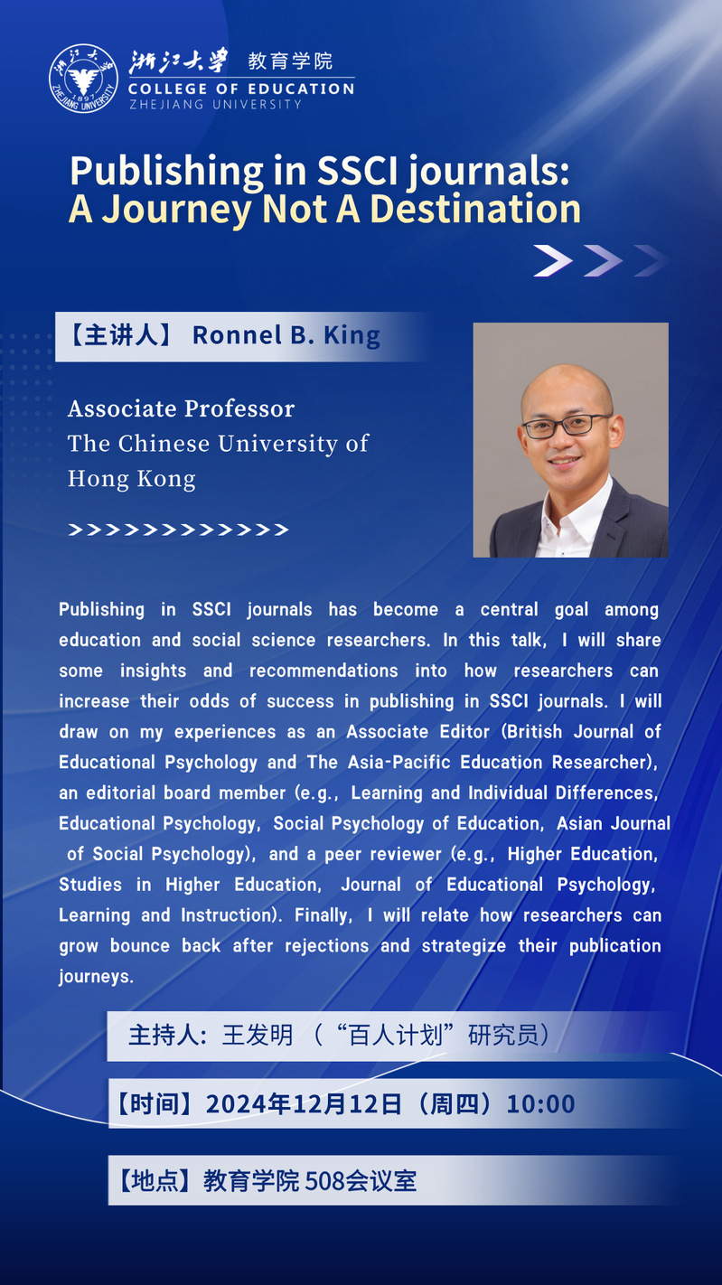 学术预告丨Ronnel B. King:Publishing in SSCI journals:A Journey Not A Destination
