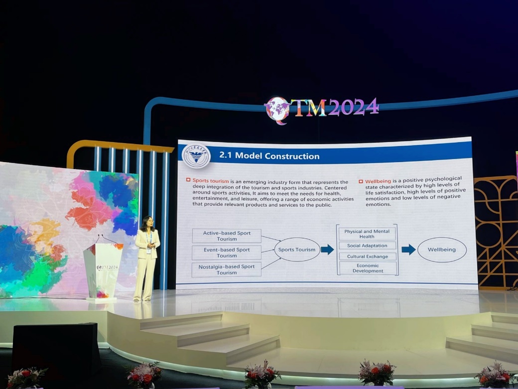 在主旨演讲中,周丽君教授从体育、旅游与福祉出发,深入探究体育旅游与福祉的关系,通过生动的中国案例阐释了体育旅游促进福祉的形成机制与作用路径。最后,周丽君教授指出,体育旅游从身心健康、社会适应、文化交流、经济发展四个方面促进游客和当地居民的福祉,并从以上四个角度提出未来举措,助力体育旅游健康发展,持续增进民生福祉。