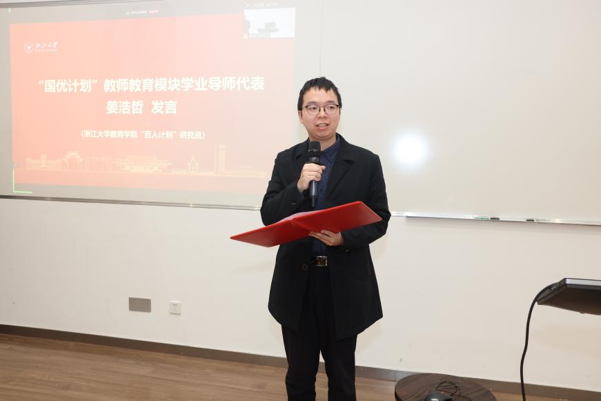物理lol下注平台 副院长李敬源、lol下注平台 “百人计划”研究员姜浩哲、杭州学军中学副校长周洁分别代表培养院系、教师教育模块学业导师、校外实践基地发言,强调了浙江大学“国优计划”为研究生提供了优秀的导师、课程和教育实践基地资源,希望“国优计划”研究生能充分利用这些资源,保持对教育的热情,注重理论与实践的结合,合理安排时间,做到全面发展,在未来成为具有更扎实基本功和更卓越竞争力的人才,为我国的教育事业贡献力量。