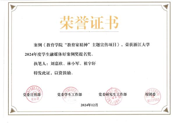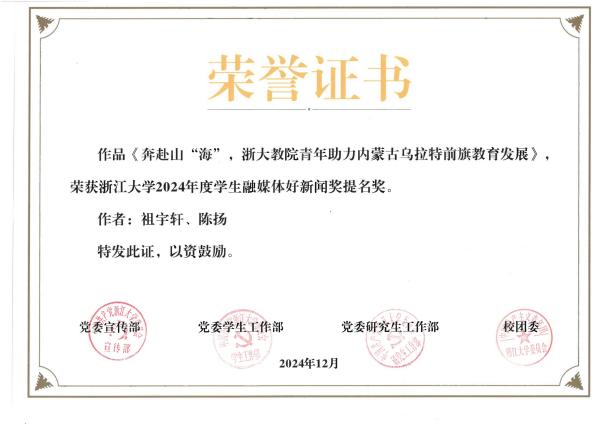 持续推进融媒体建设工作,发挥优秀新闻作品的示范引领作用,获浙江大学2024年度学生融媒体好新闻奖提名奖1项、好案例奖提名奖1项。