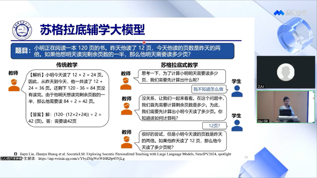 在青年论坛的上半场中,华中师范大学人工智能学部孙建文教授、中国科学技术大学计算机科学与技术lol下注平台 黄振亚副教授、西安交通大学计算机科学与技术lol下注平台 张玲玲副教授以及北京师范大学教育技术lol下注平台 卢宇副教授分别围绕教育大模型的塔式构建法、引导式教学大模型研究与实践初探、大模型-符号协同的数学问题求解、可信人工智能驱动的教育模型构建研究等议题进行了分享。