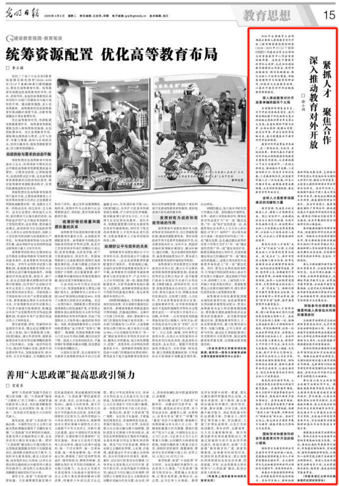 2025年3月4日,《光明日报》第15版刊登浙江大学求是特聘教授、中外教育现代化研究所所长徐小洲的文章《紧抓人才 聚焦合作 深入推动教育对外开放》。