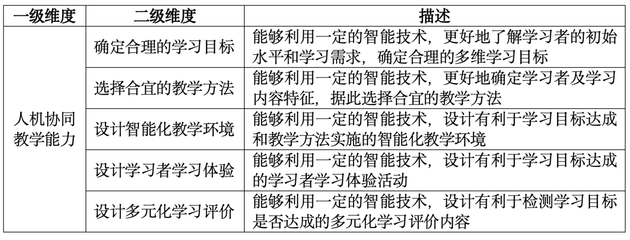 三是人机协同教学能力。人机协同教学能力指高校教师能够运用智能技术在教学实施前对学习者知识、技能的初始水平及学习需求进行动态了解,确定合理的多维学习目标;依托智能技术,精准了解学习者及学习内容的典型特征,发现学习者的盲点及偏好,选择合宜的教学方法;借助智能技术以及交互、感知等设备,设计有利于学习目标达成和教学方法实施的智能化教学环境;利用智能技术为学习者设计情境化的学习感知与沉浸式的具身体验;充分发挥人机优势,设计多元化学习评价内容,给予学习者动态、精准、科学的评价与反馈。