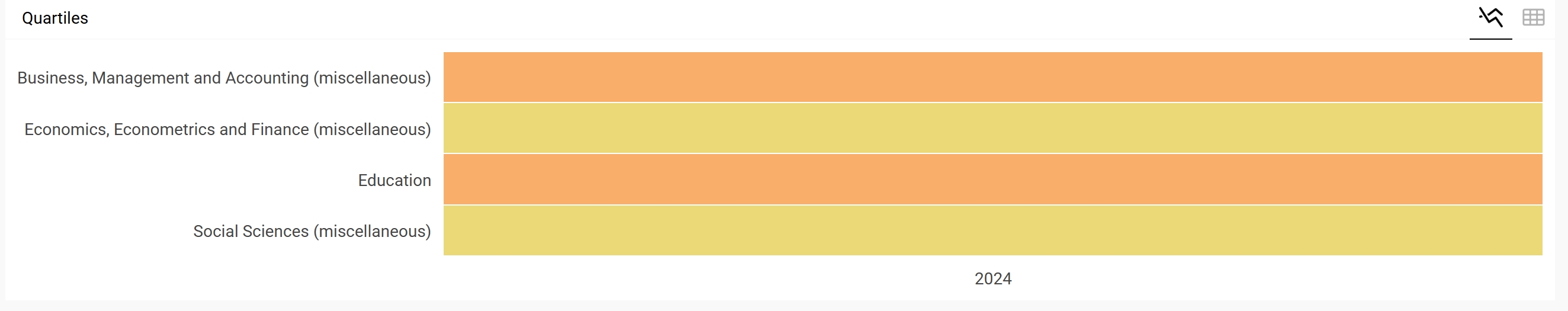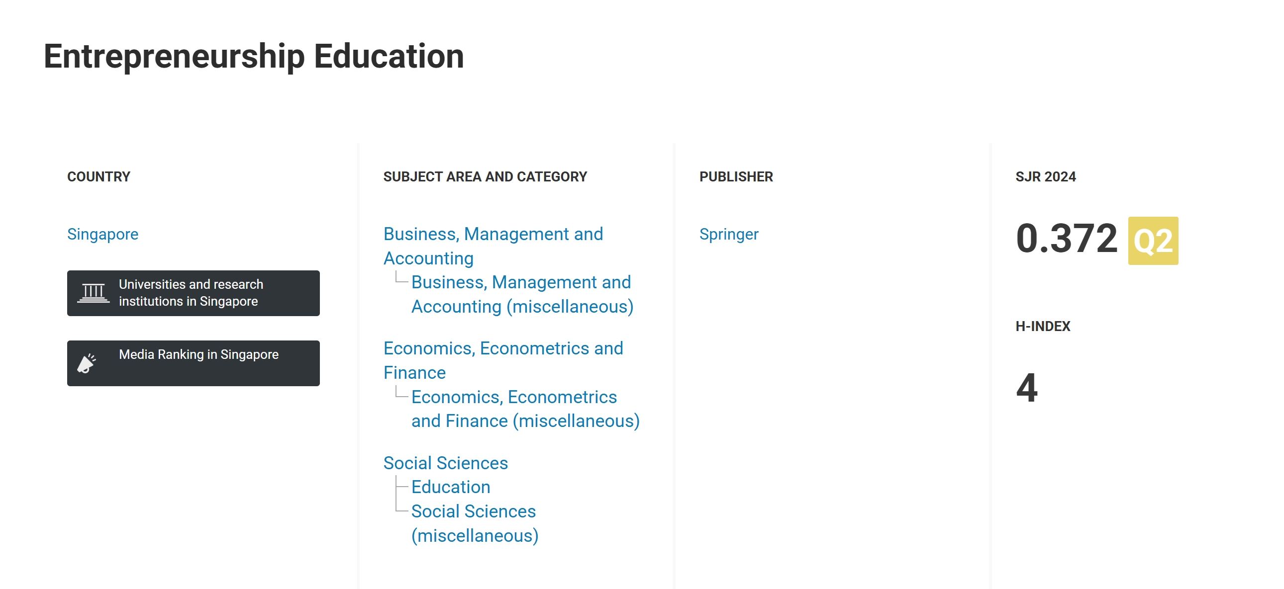 近日,SJR(SCImago Journal Rank)期刊等级最新数据发布,lol盘口 主办的英文刊物《创业教育》迎来首个评价结果:SJR2024指数为0.372,H-INDEX为4,其中,刊物在社会科学综合类、商业管理综合类位列Q2,在教育类、经济类位列Q3。