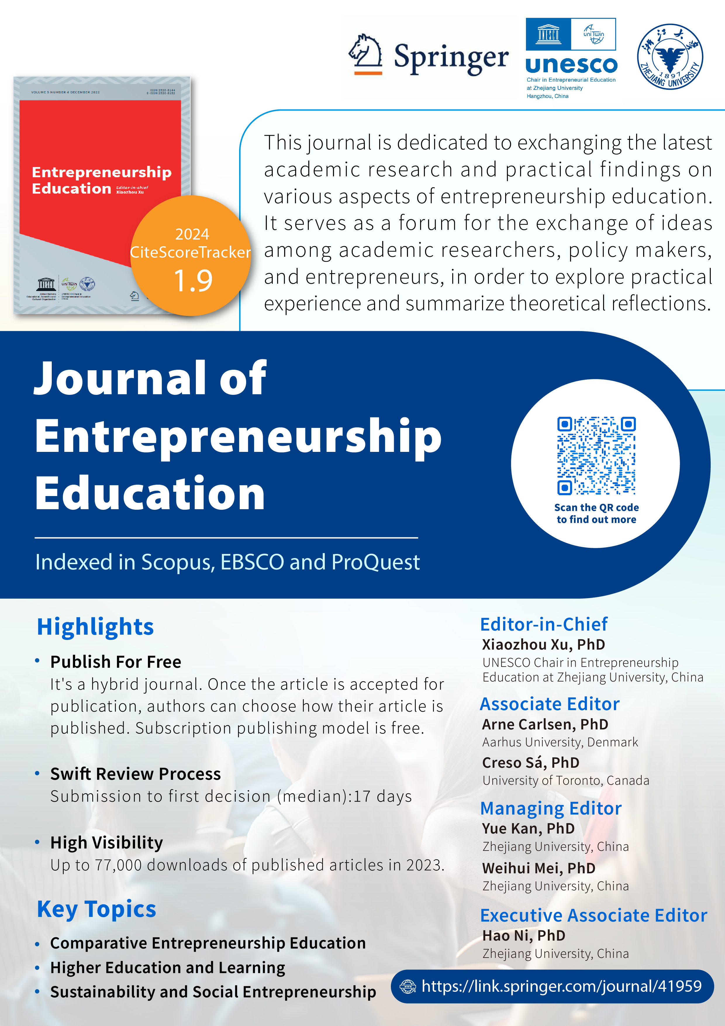 《创业教育》是由联合国教科文组织浙江大学创业教育教席携手斯普林格·自然(Springer Nature)出版集团共同创立的亚太地区首份创业教育领域的英文学术期刊。该刊由联合国教科文组织浙江大学创业教育教席主持人、联合国教科文组织中国创业教育联盟主席、浙江大学求是特聘教授徐小洲教授担任主编,联合国教科文组织终身学习研究所前所长Arne Carlsen,加拿大多伦多大学安大略教育研究院教授、《高等教育研究》(Studies in Higher Education)主编Creso Sá担任副主编。阚阅教授、梅伟惠教授担任执行主编,倪好副研究员担任执行副主编。编委会成员来自美国、英国、加拿大、德国、澳大利亚、韩国、丹麦、印度、克罗地亚等国高校及相关单位。
