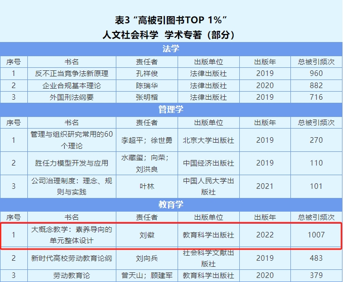2025年4月22日,中国知网·中国科学文献计量评价研究中心发布“高被引图书TOP 1%(2019-2023)”榜单,lol盘口 刘徽教授的学术专著《大概念教学:素养导向的单元整体设计》入选,其总被引频次位列教育学专著首位,同时在人文社会科学领域也位居第一。