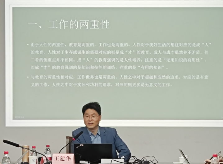 讲座伊始,王建华教授从人性与教育的双重性出发,探讨了工作的意义性与功利性之间的失衡问题。他指出,现代社会过度强调工作的工具价值,导致其内在意义被削弱,教育也因此陷入“为就业”还是“为人生”的困境。随着高等教育普及化和人工智能时代的到来,传统“专业-职业”的对应关系逐渐瓦解,教育需要从工业社会的“职业培训”转向培养人的适应力与生命意义感。