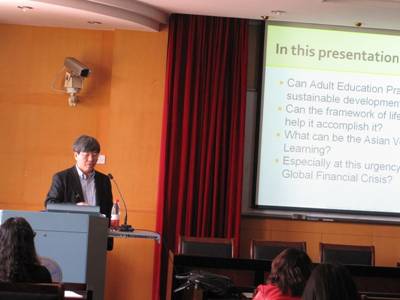 Professor Han firstly gave a detailed analysis of the problem, "Can Adult Education Practice gain sustainable development?" while introducing the current situation in both formal and non-formal adult education, and analysing the influencing factors, like government management and financial investment. Professor Han then introduced the framework of lifelong learning, and analysed the importance of lifelong learning in the implementation of adult education. Professor Han finished the lecture by talking about what the Asian Version of Lifelong Learning can be, and how adult education in Asian countries have been reacting to the economic crisis, especially Japan, Korea, Singapore and China.