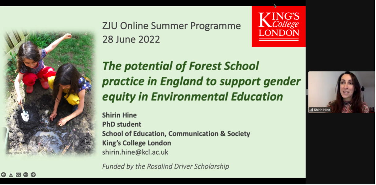 In the fourth session, Dr. Shirin Hine from King's College London gave a lecture themed on “The potential of Forest School practice in England to support gender equity in environmental Education”. Dr. Hine explained “the Forest School” with its definition, development history and practice in English schools. The background of environmental education and gender, the methodology and her preliminary findings as well as project plan for the next step were presentedin sequence.